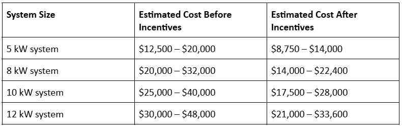 These numbers represent typical systems sized for an average household. Smaller homes with lower electricity usage may pay less, while larger homes with higher energy demand may require larger systems that cost more.